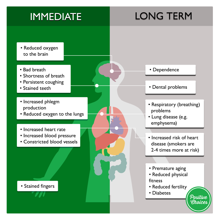 Some of the toxins in cigarette affect the mouth, throat and lungs, while others travel in the bloodstream throughout the body. The longer a person smokes, and the more often they smoke, the greater their risk of developing diseases such as lung cancer.
